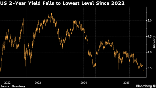 两年期国债领涨,因为它们比长期债券对美联储政策利率的预期变化更为敏感。影响 从目前情况来看,交易员已经完全消化了美联储今年剩余两次会议每次降息 25 个基点的预期。