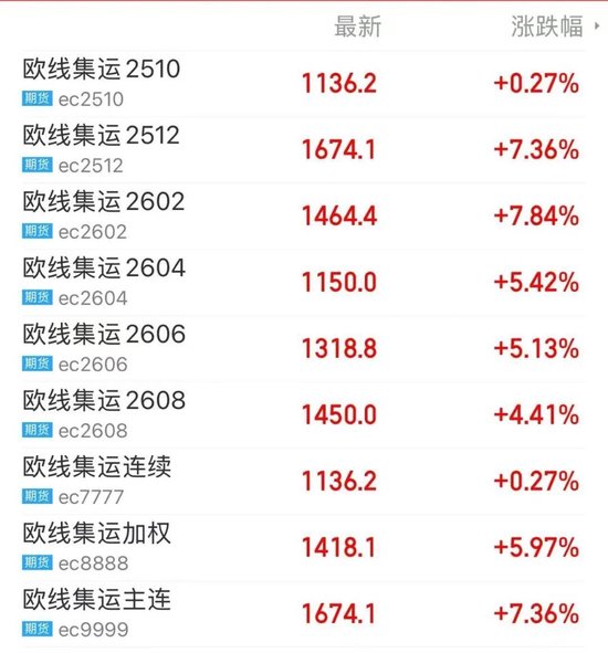 10月14日,海运集装箱期货(欧线)一改前期跌势,盘中快速上涨。主力2512合约上涨7.36%,收于1674.1点; 2602合约上涨7.84%,收于1464.4点;多个遥远月份的合同有所增加。